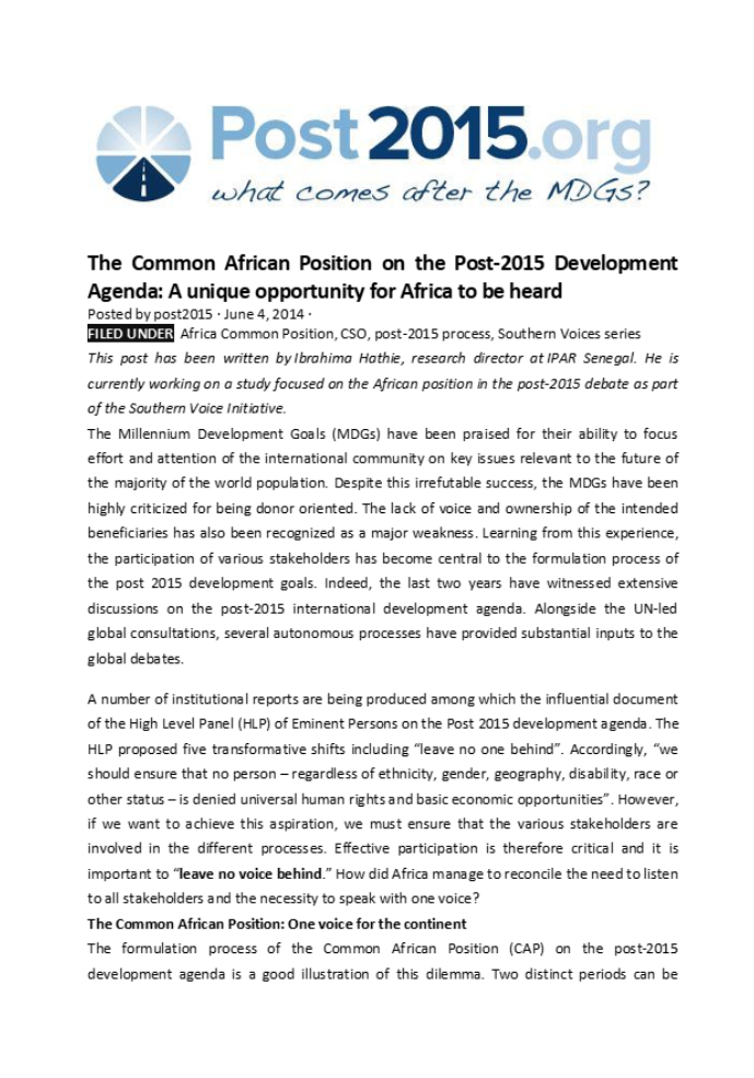 Africa Common Position, CSO, post-2015 process, Southern Voices series This post has been written by Ibrahima Hathie, research director at IPAR Senegal. He is currently working on a study focused on the African position in the post-2015 debate as part of the Southern Voice Initiative. The Millennium Development Goals (MDGs) have been praised for their […]