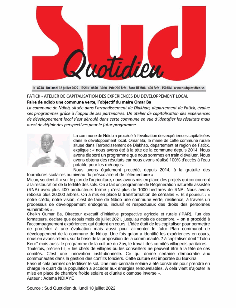 Transition agroécologique au Sénégal : La commune de Ndiob, un creuset d’expériences innovantes, un modèle à vulgariser