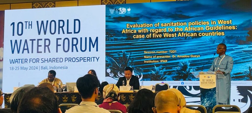 S’agissant de la thématique sur « Enabling environment for the development of sanitation services and hygiene », Dr Amadou Gueye (spécialiste en assainissement à IPAR), en tant que panéliste, a présenté les résultats de la recherche sur « Evaluation of sanitation policies in West Africa with regard to the African Guidelines : case of five West African countries ». Il a mis l’accent sur le fossé entre les politiques qui semblent sur le papier bien ficelées et les réalités locales. Mais avant sa présentation, il s’est réjoui de la place des questions liées à l’assainissement bien présentes dans le forum, mais plaide, cependant, pour une meilleure reconnaissance par une reformulation inclusive allant vers : « Forum mondial de l’eau et de l’assainissement ».