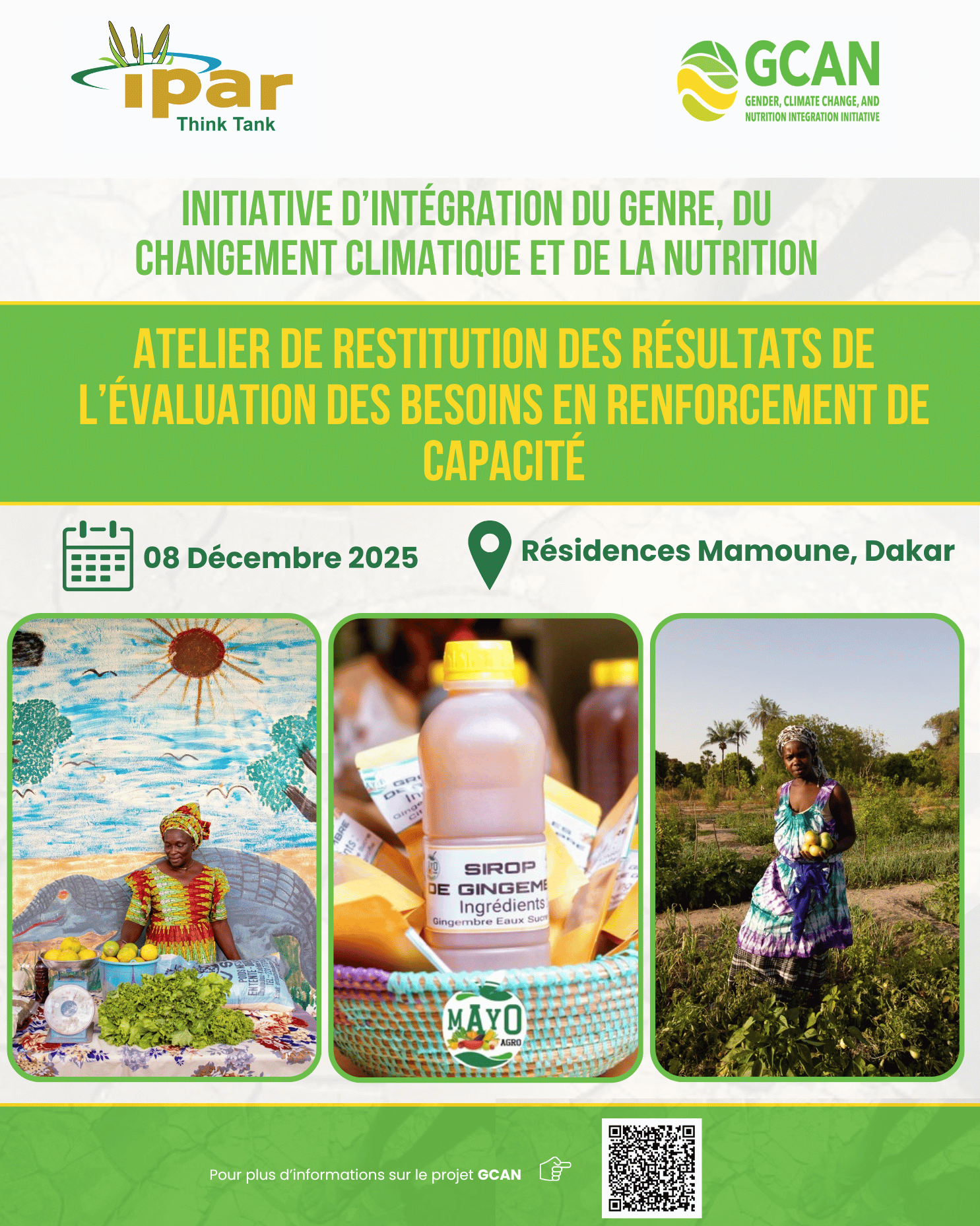 IPAR Think Tank organise le 8 décembre 2025 aux Résidences Mamounes de Dakar (à partir de 9h) un atelier de restitution des résultats de l’évaluation des besoins en renforcement de capacité des acteurs du nexus changement climatique, genre et nutrition.